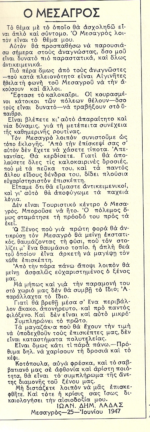 | Πρόσκληση για παραθερισμό στο Μεσαγρό σε αιγινήτικη εφημερίδα του 1947. |