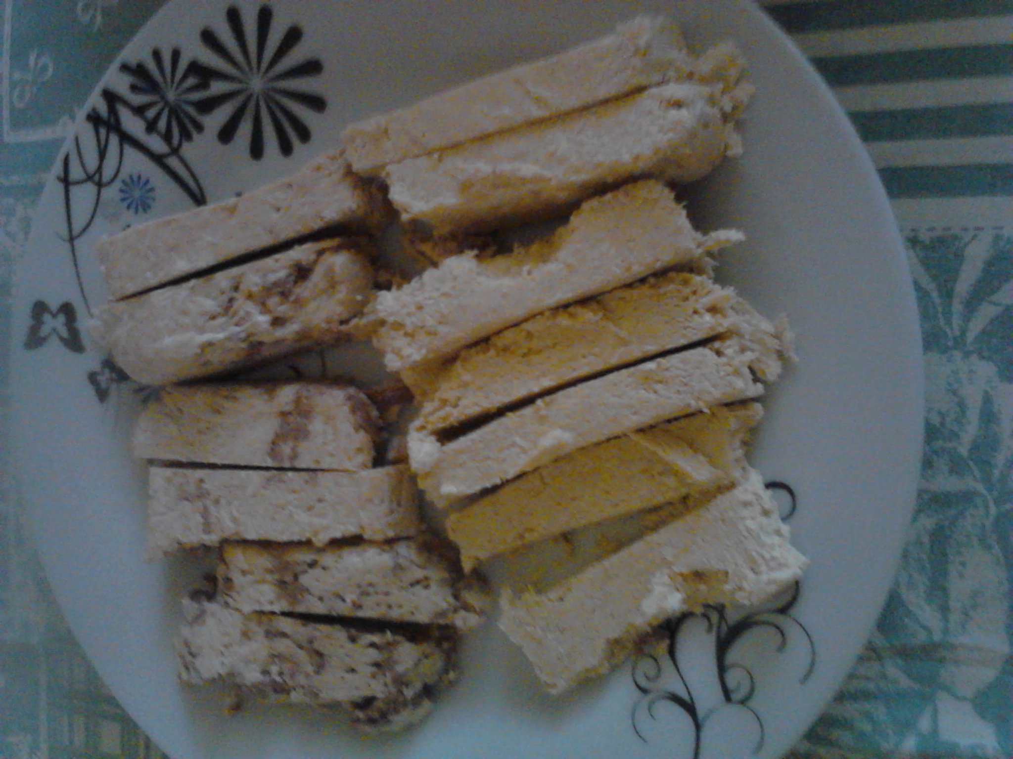 Κόβομε τα φύλλα κατά μήκος σε τρεις λουρίδες. Βάζουμε τρεις λουρίδες τη μία πάνω από την άλλη βουτυρώνοντας ανάμεσα. Βάζουμε στην άκρη λίγο φιστίκι ανακατεμένο με τη φρυγανιά και διπλώνουμε σε τρίγωνα (όπως θα κάναμε στα τυροπιτάκια).