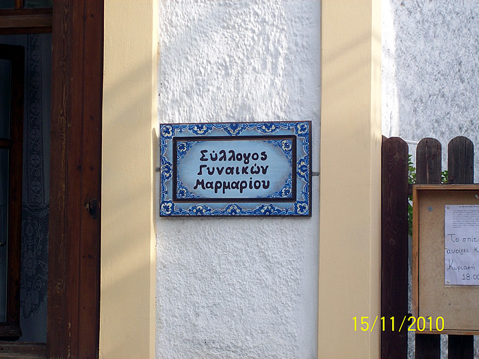 Ξεκίνησε δειλά από 20 γυναίκες του Μαρμαρίου που είχαν αγάπη και μεράκι να φτιάξουν κάτι όμορφο, για τις ίδιες, τα παιδιά τους και τα εγγόνια τους. Σήμερα, αυτές οι γυναίκες είναι 135 στον αριθμό. Πέρα από τις δραστηριότητες που έγιναν, φτιάξανε και έναν όμορφο χώρο. Ένα σπίτι παραδοσιακό, ένα σπίτι που θύμιζε σε όλους το πώς ήταν παλιά το Μαρμάρι. Στο σπίτι αυτό οι γυναίκες του τόπου ξεδιπλώσανε ό,τι αναμνήσεις είχαν από τα παλιά. Φωτογραφίες που απεικονίζουν παλαιότερες στιγμές της καθημερινής ζωής και των επαγγέλματων που έχουν πλέον εκλείψει, ενώ παραδοσιακά είδη τέχνης, χειροτεχνίας και οικιακού εξοπλισμού κοσμούν αυτό το χώρο που μας μεταφέρει στο παρελθόν. Τουρίστες, ξένοι και Έλληνες που παραθερίζουν στον τόπο μας, επισκέπτονται συχνά το σπίτι του Συλλόγου το οποίο έχει κτιστεί το 1917.