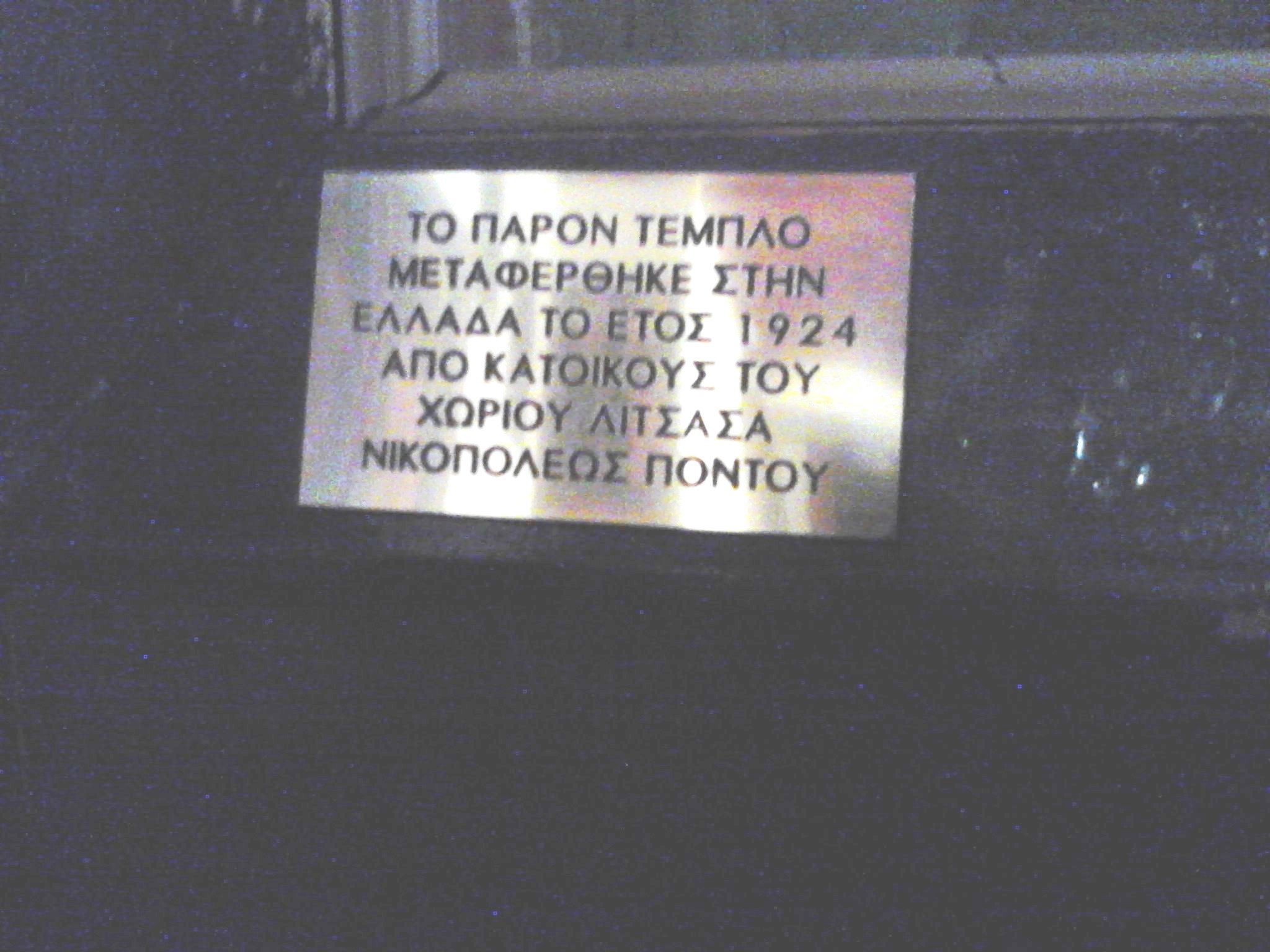 Η ιστορία του τέμπλου ξεκινά από τη Λίτζασα, ένα χωριό βόρεια της Νικόπολης. Οι κάτοικοι εκεί έχτισαν δύο ναούς, αμφότεροι με το όνομα του Αγίου Γεωργίου τουΤροπαιοφόρου, τον οποίο διακοσμούσε ένα ξύλινο χειροποίητο γλυπτό τέμπλο. Ποιος όμως είναι ο πραγματικός λόγος της μεταφοράς του τέμπλου στο χωριό μας; Το τέμπλο αυτό ήρθε στην Ελλάδα με την ανταλλαγή πληθυσμών (1922-1924), ένα από τα μεγαλύτερα προσφυγικά ρεύματα που σημειώθηκε ποτέ την εποχή εκείνη.