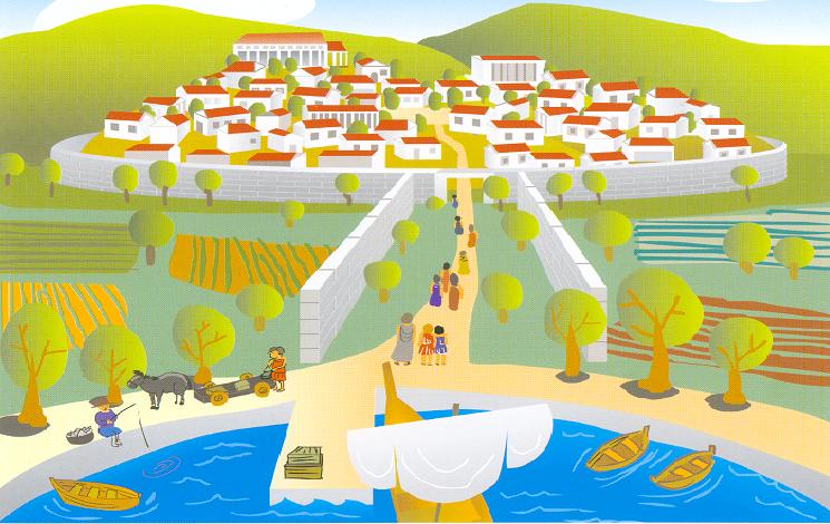 | Η Νίσαια, το αρχαίο λιμάνι της πόλης στο Σαρωνικό, όπως το φαντάζονται οι αρχαιολόγοι (Πηγή: Αυγερινού & Βόρδος x.x.) |