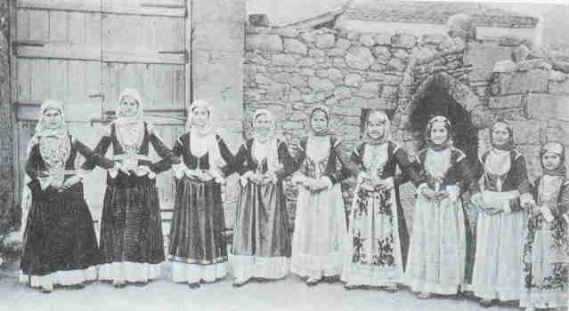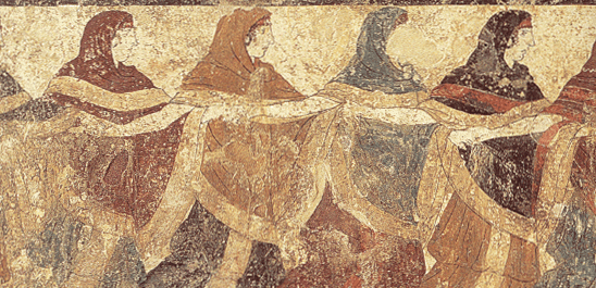 | Ο χορός από τοιχογραφία της Κάτω Ιταλίας -πιθανόν ο χορός των πεπλοφόρων παρθένων- γύρω στο 400 π.Χ. (Πηγή: http://annaswebart.com/culture/dancehistory/history) | Ο χορός της τράτας - τέλος 19ου αι. (Πηγή: Παπαηλίας 1993) |