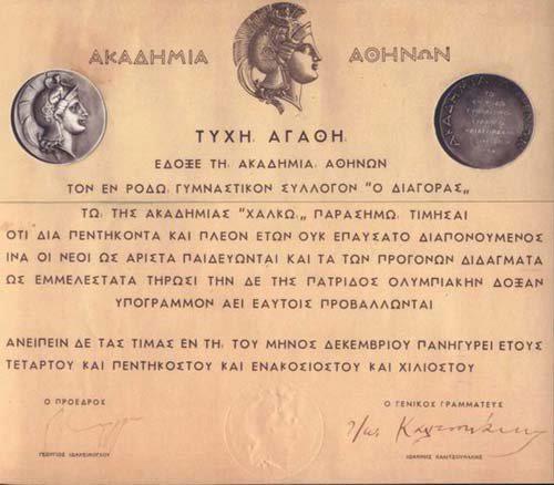 «Τύχη αγαθή έδοξε τη Ακαδημία Αθηνών τον εν Ρόδω γυμναστικόν σύλλογον «Ο ΔΙΑΓΟΡΑΣ» τω της Ακαδημίας χαλκώ παρασήμω τιμήσαι ότι δια πεντήκοντα και πλέον ετών ουκ επαύσατο διαπονούμενος ινα οι νέοι ως άριστα παιδεύωνται και τα των προγόνων διδάγματα ως εμμελέστατα τηρώσι την δε της πατρίδος ολυμπιακήν δόξαν υπόγραμμον αεί αυτοίς προβάλλωνται, ανειπειν δε τας τιμάς εν τη του μηνός Δεκεμβρίου πανηγύρει έτους τετάρτου και πεντηκοστού και εννακοσιοστού και χιλιοστού».