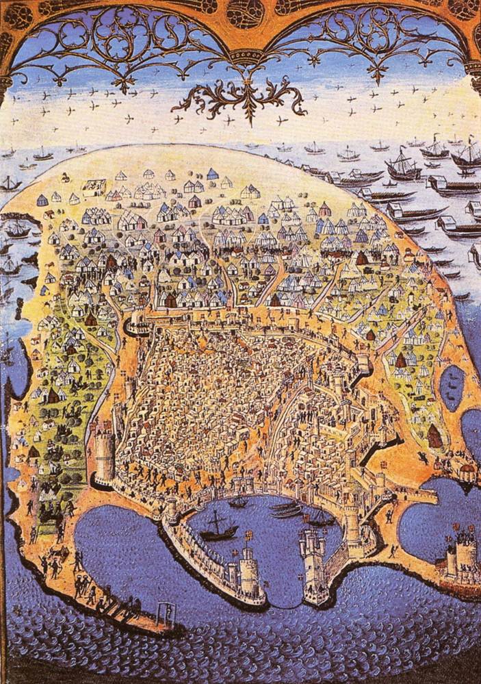 | Μικρογραφία της μεσαιωνικής πόλης της Ρόδου από τον χειρόγραφο κώδικα του Caoursin |