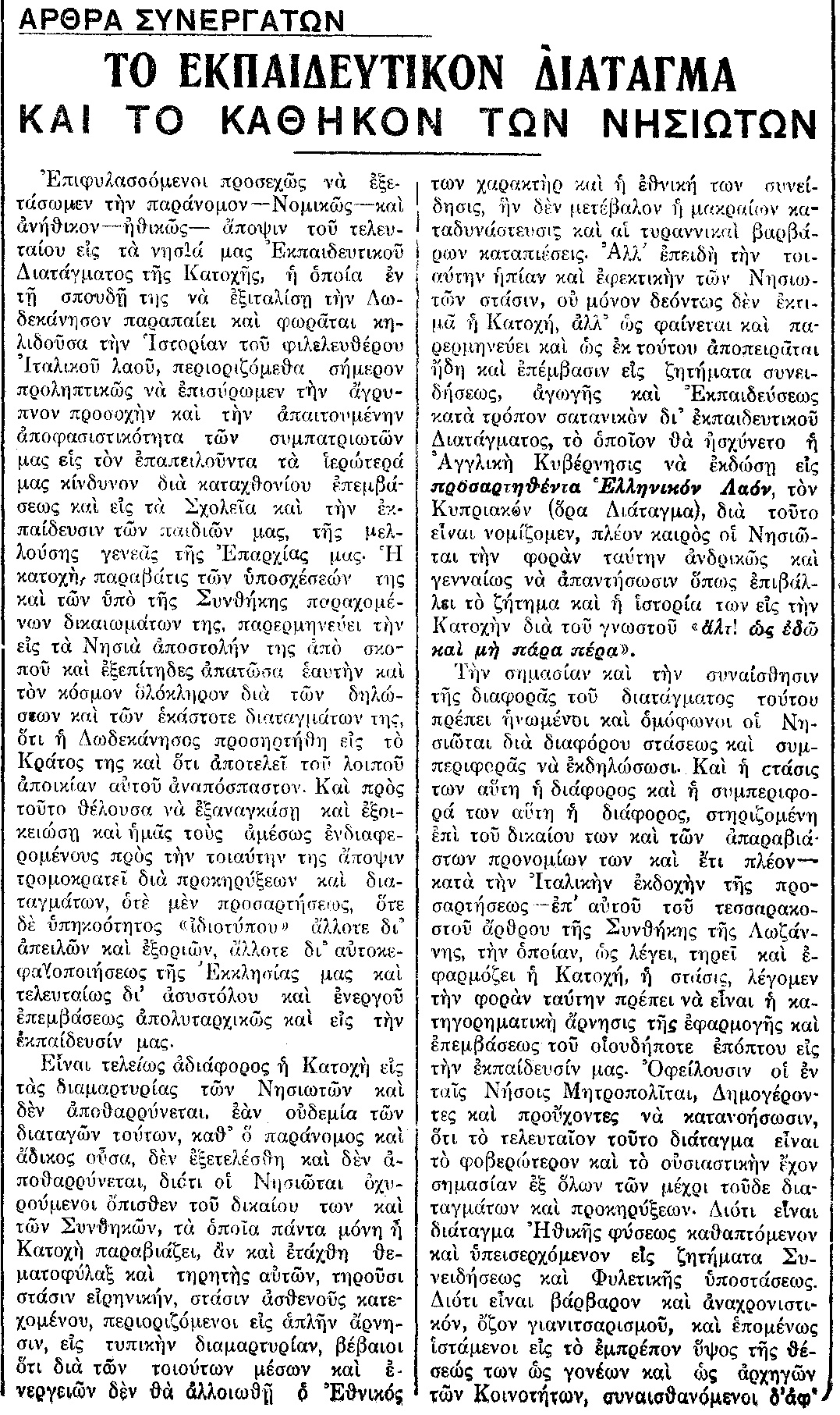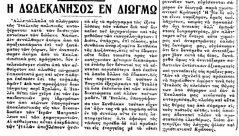 Γράφει χαρακτηριστικά: ”επισύρομεν την άγρυπνον προσοχήν και την απαιτουμένην αποφασιστικότητα των συμπατριωτών μας εις τον επαπειλούντα τα ιερώτερά μας κίνδυνον, δια καταχθονίου επεμβάσεως εις τα Σχολεία και την εκπαίδευσιν των παιδιών μας”. Στην τρίτη σελίδα του ίδιου φύλλου σε άρθρο με τίτλο “Η άκαμπτος δωδεκανησιακή ψυχή” εκφράζεται η ικανοποίηση από τις ειδήσεις οι οποίες αναφέρονται στην αντίδραση των κατοίκων να εφαρμόσουν το νέο σχολικό Κανονισμό: “οι πληθυσμοί όλων, άνευ ουδεμιάς εξαιρέσεως, των νήσων μας, έχουν αδιάσειστον απόφασιν όπως αγνοήσουν, κατά τρόπον τον οποίον εκείνοι γνωρίζουν το απαίσιον Διάταγμα, διότι οι πληθυσμοί των νήσων μας έχουν ακλόνητον απόφασιν όπως ορθώσουν έναντι της αχαρακτηρίστου ταύτης Ιταλικής ενεργείας της ενεντίον παντός ηθικού νόμου και πάσης ιδέας δικαίου, το πανίσχυρον των ψυχών των τείχος χαλυβδωμένον με τον πόνον, την οργήν και το θανάσιμον μίσος άτινα πάντα εξαπέλυσεν η στάσις της Ιταλίας”