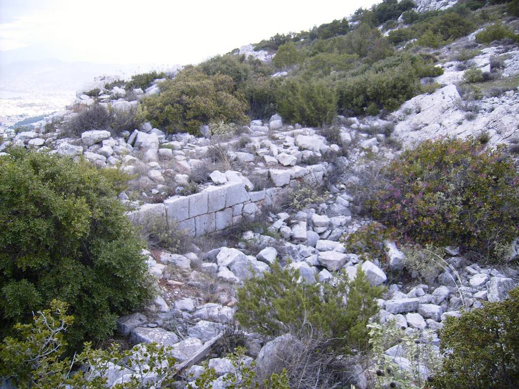 - δυτικά, το μεγάλο βουνό Σαλγανέας την κορυφή του οποίου στεφανώνει αρχαίο οχυρό, δημιούργημα του Αντιγόνου, επίγονου του Μ. Αλεξάνδρου που έστειλε τον Πτολεμαίο για να ελευθερώσει τις ελληνικές πόλεις. Εκείνος μάλιστα, αφού τοίχισε το Σαλγανέα έφτιαξε μικρά οχυρά στις κορυφές των γύρω υψωμάτων (Σγάλια, Τσούκα, Μαδάρι, Γαλατσίδεδα, Κλεφτολούτσου, Ταμπούρια, Γκριτζιώτη, Μεσοβούνι) ως το Μεσσάπιον όρος, τον Κτυπά, συνδέοντάς τα με τείχος, με δρόμο 11 km ώστε να υπάρχει ισχυρή προστασία