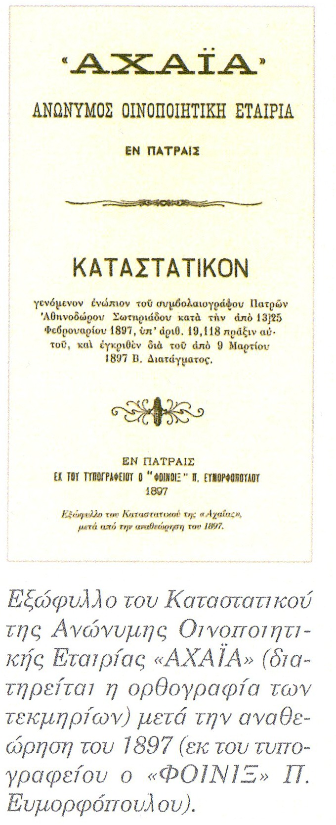 Η ίδρυση της εταιρείας της ελληνικής οινοποιίας στην Πάτρα αν και η ιστορία της είναι μια ιστορία αποτυχίας, σηματοδοτεί την έναρξη μιας διαδικασίας που τα αποτελέσματά της φαίνονται 20 χρόνια αργότερα όταν η Πάτρα εκτός από εξαγωγικό κέντρο σταφίδας που είναι, θα γίνει και οινοποιιτικό κέντρο. Η οινοποιία εγκαθίσταται στην περιοχή του Άγιου Διονυσίου όπου συγκεντρώνονται και άλλες βιομηχανίες. Στην εταιρεία προσελήφθησαν 3 οινοποιοί : 1 έλληνας και 2 γάλλοι.