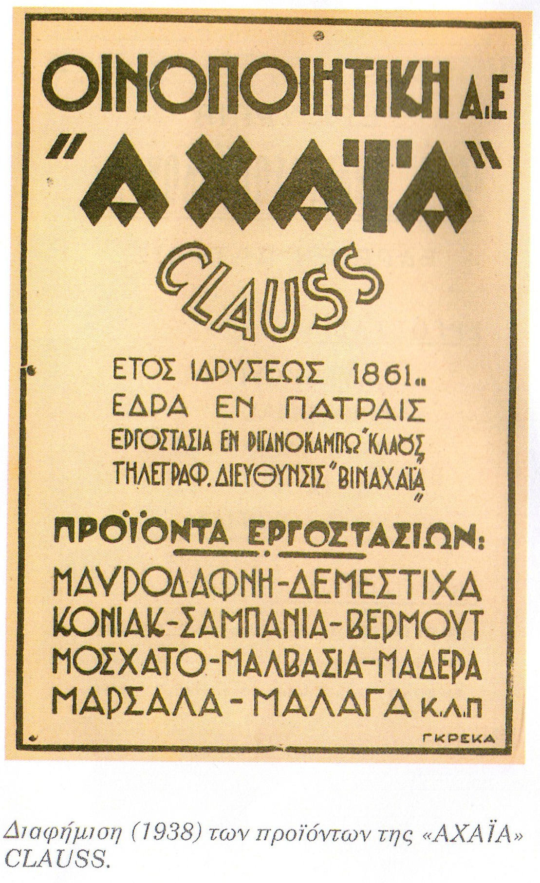 Τα πρώτα κρασιά της εταιρείας παράγονται το 1861 και είναι ένα αφρώδες, ένα μαύρο επιτραπέζιο , ένα λευκό και ένας κόκκινος σταφιδίτης. Το ακριβότερο είναι το αφρώδες και το φθηνότερο το μαύρο. Η εταιρεία διέκοψε τις εργασίες της το 1875 αλλά άνοιξε δρόμους γιατί ταυτόχρονα με την διακοπή των εργασιών της δημιουργούνται στην Πάτρα οινοβιομηχανίες από τους ίδιους τους ανθρώπους που έπαιξαν βασικό ρόλο στην ίδρυσή της. Μια από τις οινοβιομηχανίες αυτές είναι η ΑΧΑ'Ι'Α (κατοπιν ΑΧΑ'Ι'Α ΚΛΑΟΥΣ). Ανάμεσα στους μετόχους της εταιρείας της ελληνικής οινοποιίας ήταν πολλοί έμποροι και οι δύο μεγαλύτερες εταιρείες σταφίδας η Αγγλική Burff και η γερμανική Fels.