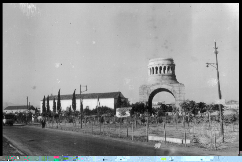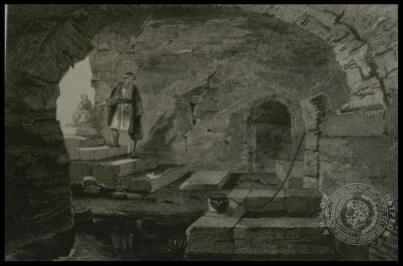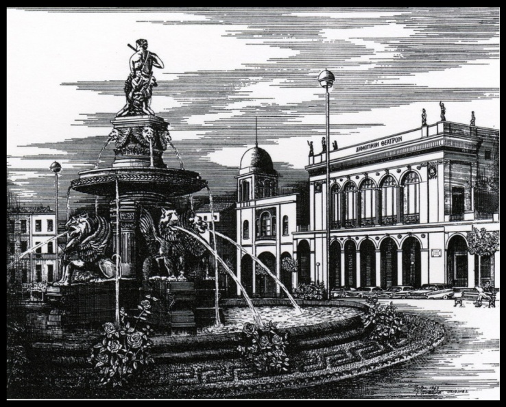 | Γκραβούρα του επάνω συντριβανιού και του Δημοτικού Θεάτρου Απόλλων |
