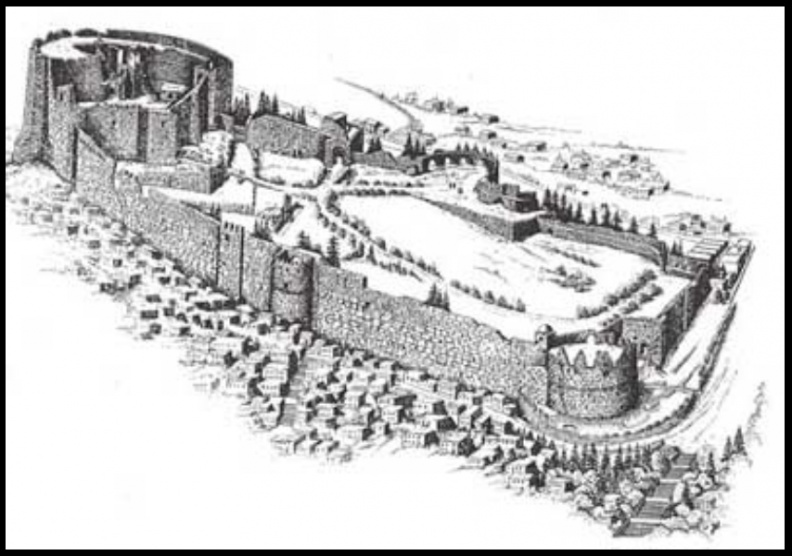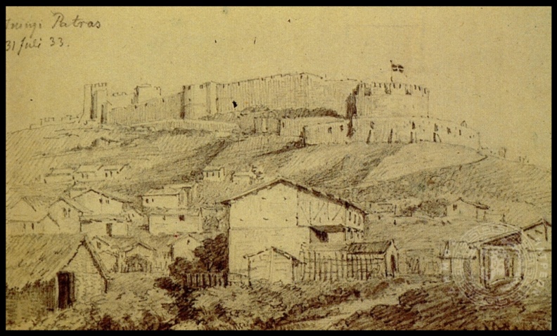 | Άποψη της Πάτρας από τα Νοτιοδυτικά του κάστρου.Διακρίνεται η μεγάλη αυλή του συγκροτήματος. |