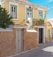 Τα σπίτια είναι πολύ κοντά το ένα στο άλλο. Τα περισσότερα με δύο πατώματα, ενώ τα φημισμένα καπετανόσπιτα, που δεν είναι και λίγα, έχουν τρία. Όλα τα σπίτια διέθεταν αυλή με υψηλό μαντρότοιχο, ξυλόφουρνο και στέρνα. Παράθυρα υπήρχαν απαραίτητα στην πλευρά του κτιρίου που περνούσε ο δρόμος και όταν το σπίτι ήταν διόροφο ή τριόροφο είχε και ένα μικρό μπαλκονάκι. Τα παράθυρα αυτά μάλιστα, καθώς και η πόρτα του ισογείου και του μπαλκονιού στολίζονταν με αψιδωτές πέτρες (χρήσιμες για την εκτόνωση του βάρους πάνω από το σενάζι) που δεν σοβατίζονταν ή ήταν τα ίδια αψιδωτά. Η κύρια είσοδος του σπιτιού συνήθως ήταν από την αυλόπορτα στο πλάι του σπιτιού και κατεύθυνε τον επισκέπτη στον όροφο.