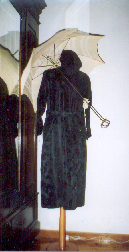 Παλιά είχανε τη ζακέτα ή το φόρεμα το φαρδύ. Είχε η μητέρα μου κάτι μισοφόρια με χασέ, σαν το κομπινεζόν που λέμε. Και κάτω κάτω είχε ένα φράμπαλο σουρωτό και η μητέρα μου το είχε κάνει κοφτό. Το έχω κάνει τώρα της καμινάδας... Το νυφικό της στην κατοχή το χάλασα. Είχε φούστα μπεζ, είχε τη ζακέτα, εδώ είχε δυο κορδέλες με κρόσια από κάτω και δυο στρογγυλά σαν λουλούδια, το ίδιο ύφασμα σουρωτό. Και φορούσε την πιέτα. Κάτω έδενε με μια καρφίτσα με το όνομα Σταματίνα, αριστερά και δεξιά είχε δυο καρφίτσες-αστεράκια. Η πιέτα ήτανε κεντητή. Τη φοράγανε στις γιορτές που πηγαίναν εκκλησία. Ήταν μπεζ.