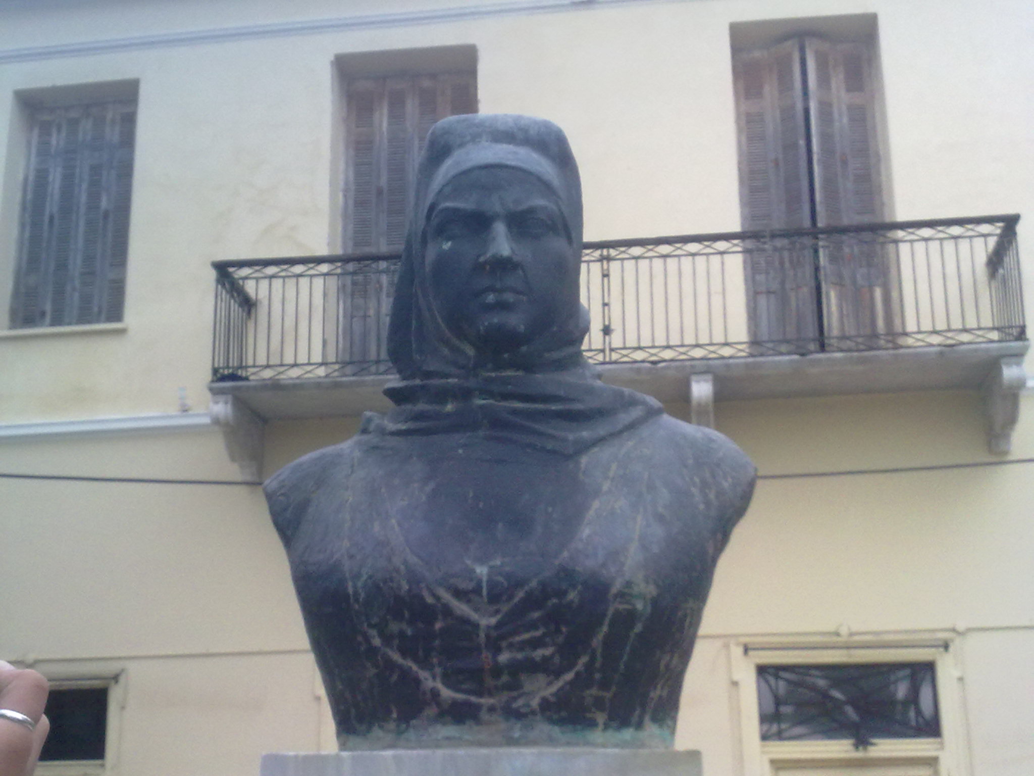 Το έργο: Τοποθετήθηκε το 2003, είναι έργο του γλύπτη Τάκη Παρλαβάντζα και παριστάνει τη Μαντώ Μαυρογένους με στρατιωτική στολή.