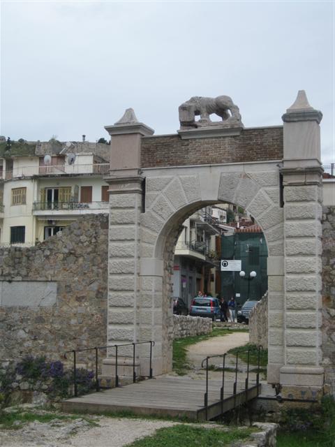 Το έργο: Η Πύλη της Ξηράς κατασκευάστηκε το 1708 από τον γάλλο μηχανικό Λασάλ. Πρόκειται για τοξωτή πύλη με δύο παραστάδες, η οποία κοσμείται στο επάνω μέρος της με ολόγλυφο λιοντάρι, έμβλημα της Δημοκρατίας της Βενετίας. Κοντά στην αριστερή παραστάδα υπάρχει αναθηματική πλάκα που μνημονεύει την κατάληψη του Ναυπλίου από τον Ενετό στρατηγό Φραντσέσκο Μοροζίνι το 1687. Η Πύλη της Ξηράς ήταν η επιβλητική είσοδος στην τειχισμένη Κάτω Πόλη από την πλευρά της ξηράς και για λόγους προστασίας έκλεινε με τη δύση του ήλιου. Μπροστά της υπήρχε τάφρος και η πρόσβαση γινόταν με κινητή ξύλινη γέφυρα. Κατεδαφίστηκε μεταξύ 1894 και 1897 και από το αρχικό έργο σώθηκε μία φωτογραφία και ελάχιστα αρχιτεκτονικά μέλη (το οικόσημο της οικογένειας του ενετού διοικητή Γκριμάνι με χρονολογία 1708 και του οίκου των Μοντσενίγκο, καθώς και το πέτρινο λιοντάρι - επίστεψη της Πύλης). Τα θεμέλιά της εντοπίστηκαν το 1973 και 25 χρόνια περίπου αργότερα το Κεντρικό Αρχαιολογικό Συμβούλιο αποφάσισε την αναστήλωσή της. Η ανακατασκευή έγινε με βάση ειδική μελέτη ώστε να προσεγγίζει όσο το δυνατόν περισσότερο την αρχική της μορφή.