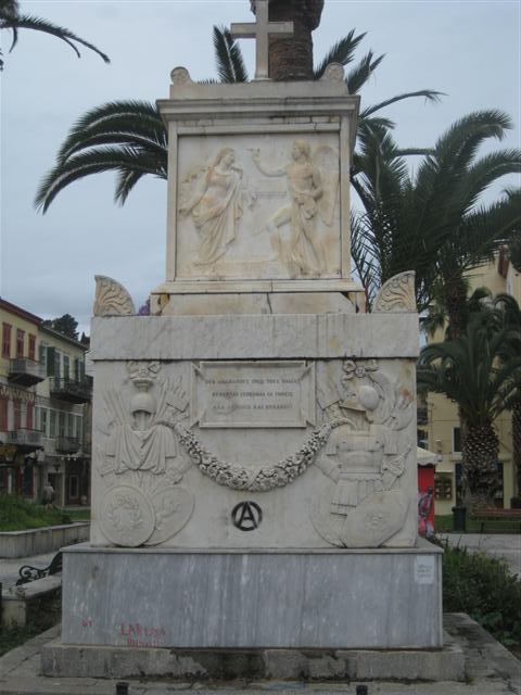 Πού: Αρχικά, το 1834, το μνημείο τοποθετήθηκε στην τότε πλατεία Πλατάνου (πλατεία Συντάγματος), μπροστά από το Αλληλοδιδακτικό Σχολείο (σήμερα Τριανόν). Το 1951 το μνημείο μεταφέρθηκε στην πλατεία Τριών Ναυάρχων.