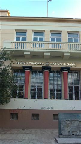 Το κτήριο της Εθνικής Τράπεζας χτίστηκε το 1936 με αρχιτέκτονα το Νικόλαο Ζουμπουλίδη, που υπήρξε και διευθυντής του καταστήματος. Φέρει επιρροές από τα μυκηναϊκά μέγαρα και απηχεί μια τελευταία στροφή προς το νεοκλασικισμό στη δεκαετία του ’30. Το ισόγειο λειτούργησε ως τράπεζα και ο όροφος ως κατοικία του διευθυντή. Το έργο δεν ολοκληρώθηκε σύμφωνα με τα σχέδια του αρχιτέκτονα. Από το μπαλκόνι του εκφωνήθηκαν κατά καιρούς πολιτικοί λόγοι όλων των αποχρώσεων.