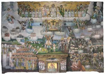 Στο ιερό σώζεται μέρος της αρχικής τοιχογραφίας που απεικονίζει την Κοίμηση της Θεοτόκου και αγιογραφήθηκε κατά την ανέργεση του ναού. Επίσης, αξιόλογη λαϊκότροπη τοιχογραφία του 1917, που εικονίζει σκηνές από τη Δευτέρα Παρουσία, σώζεται στο νάρθηκα της εκκλησίας.