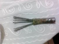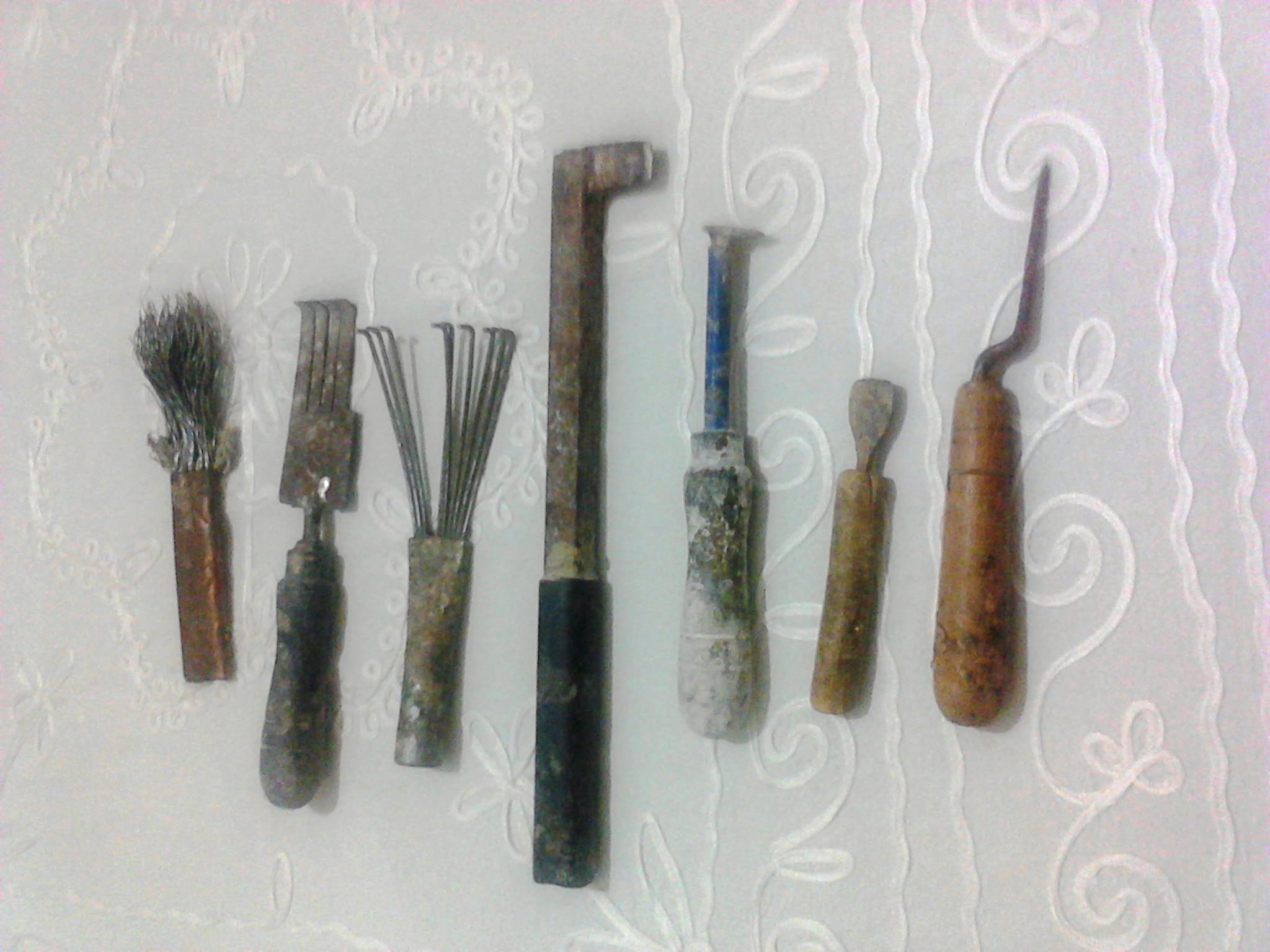 Η συρματόβουρτσα, το χτενάκι και η γυριστή σπάτουλα χρησιμοποιούνται για να ρίχνουμε το μαστίχι από τον κορμό του δέντρου. Για τα δύσκολα σημεία που είναι κολλημένο πολύ το μαστίχι χρησιμοποιούμε κλαδευτήρι.